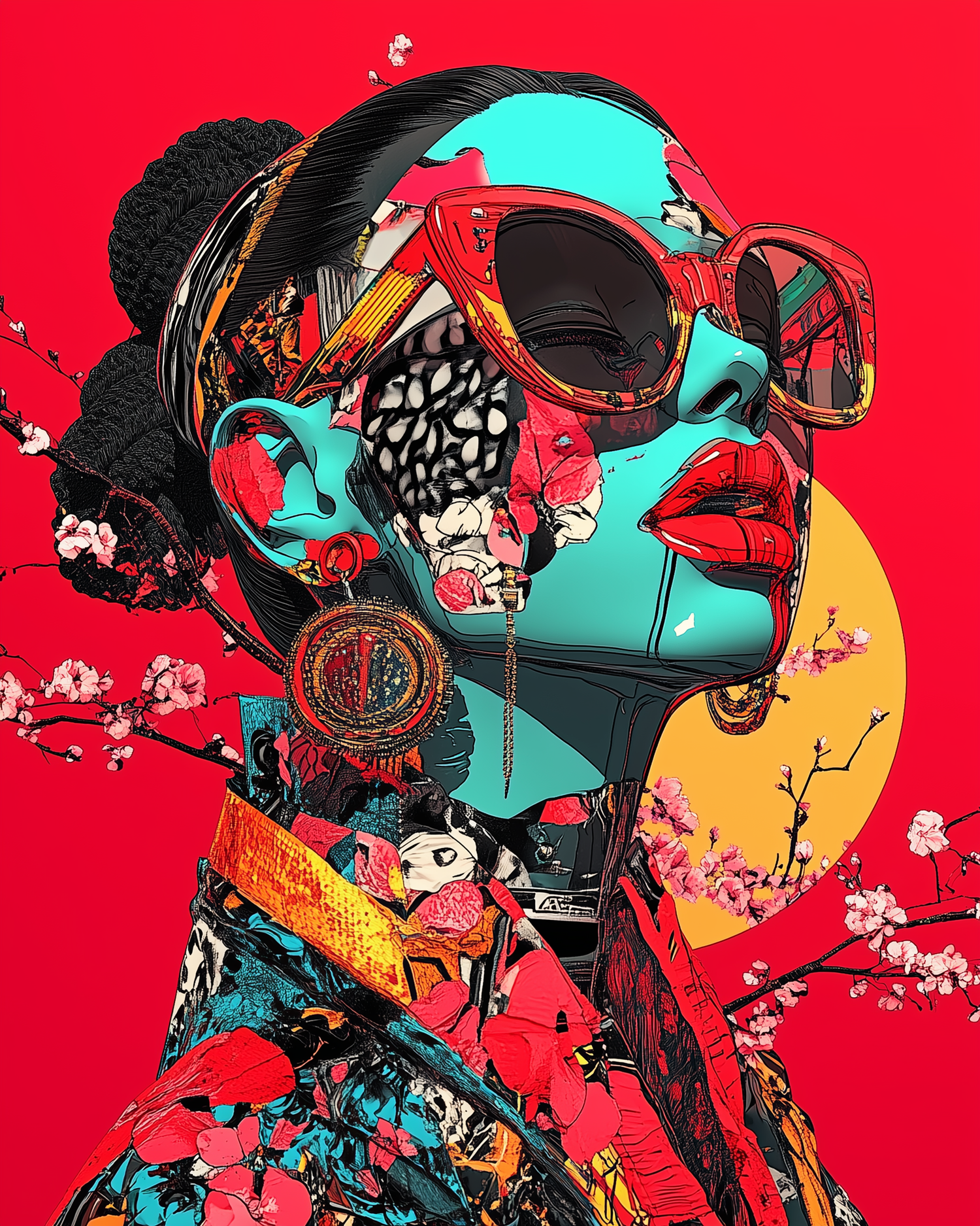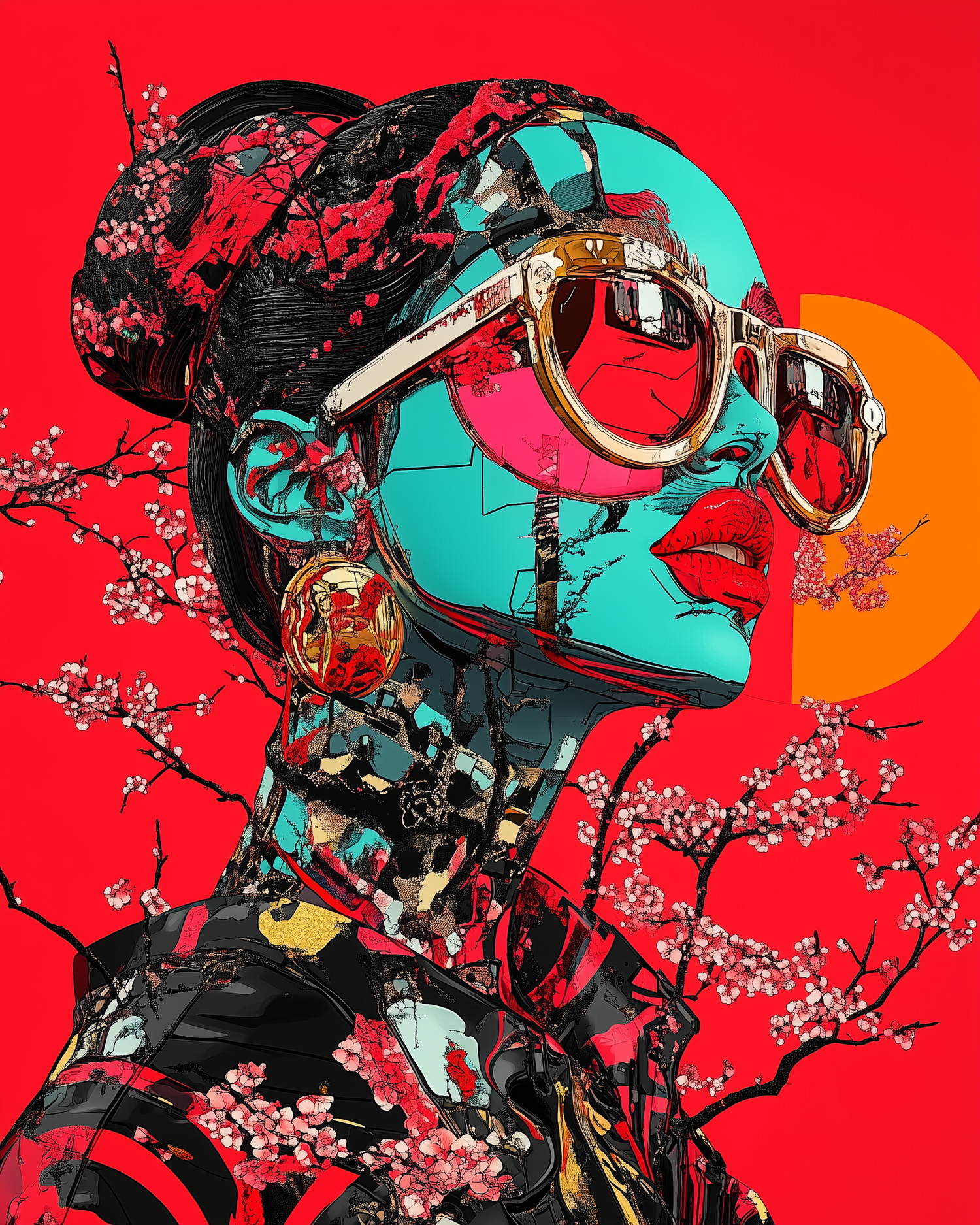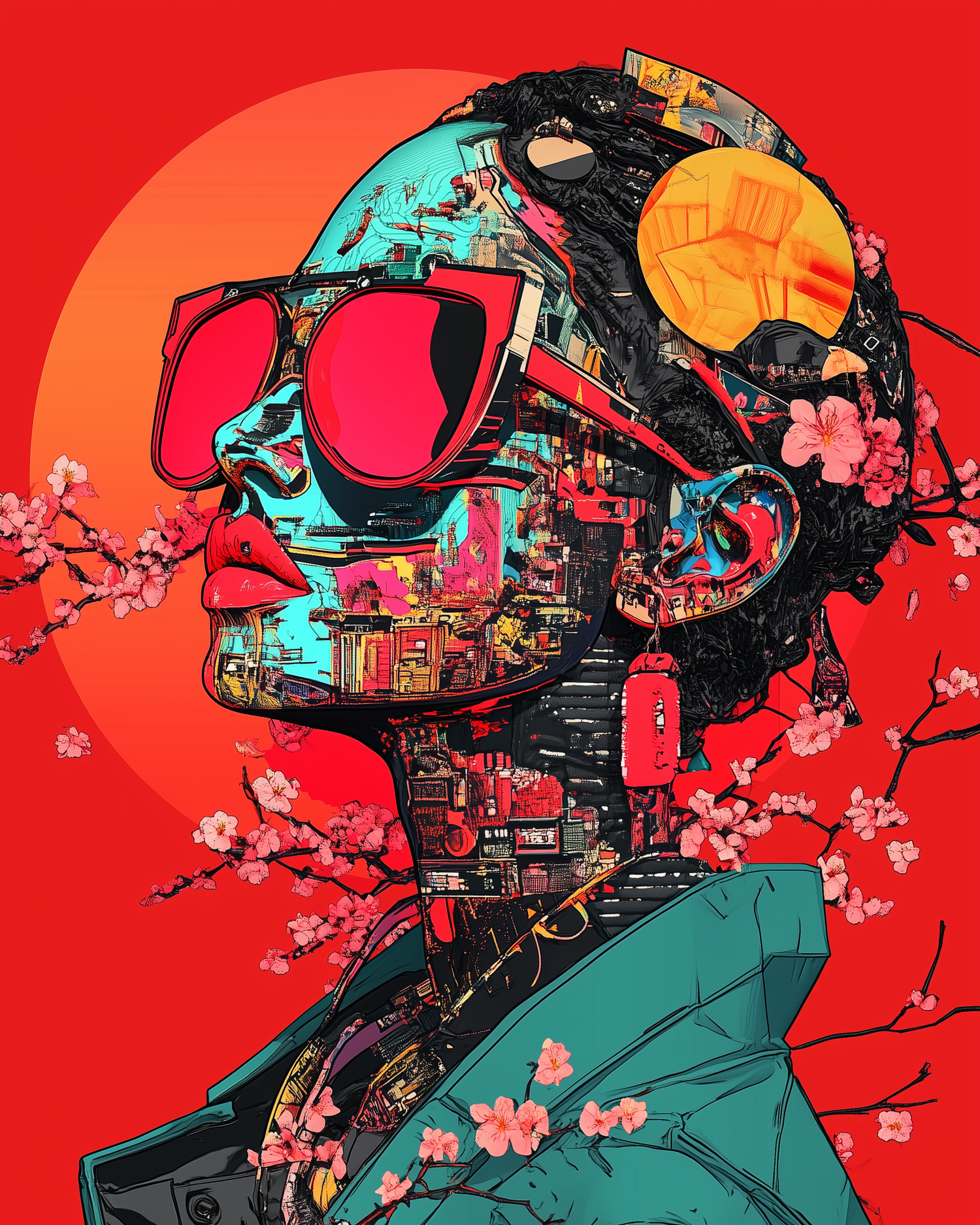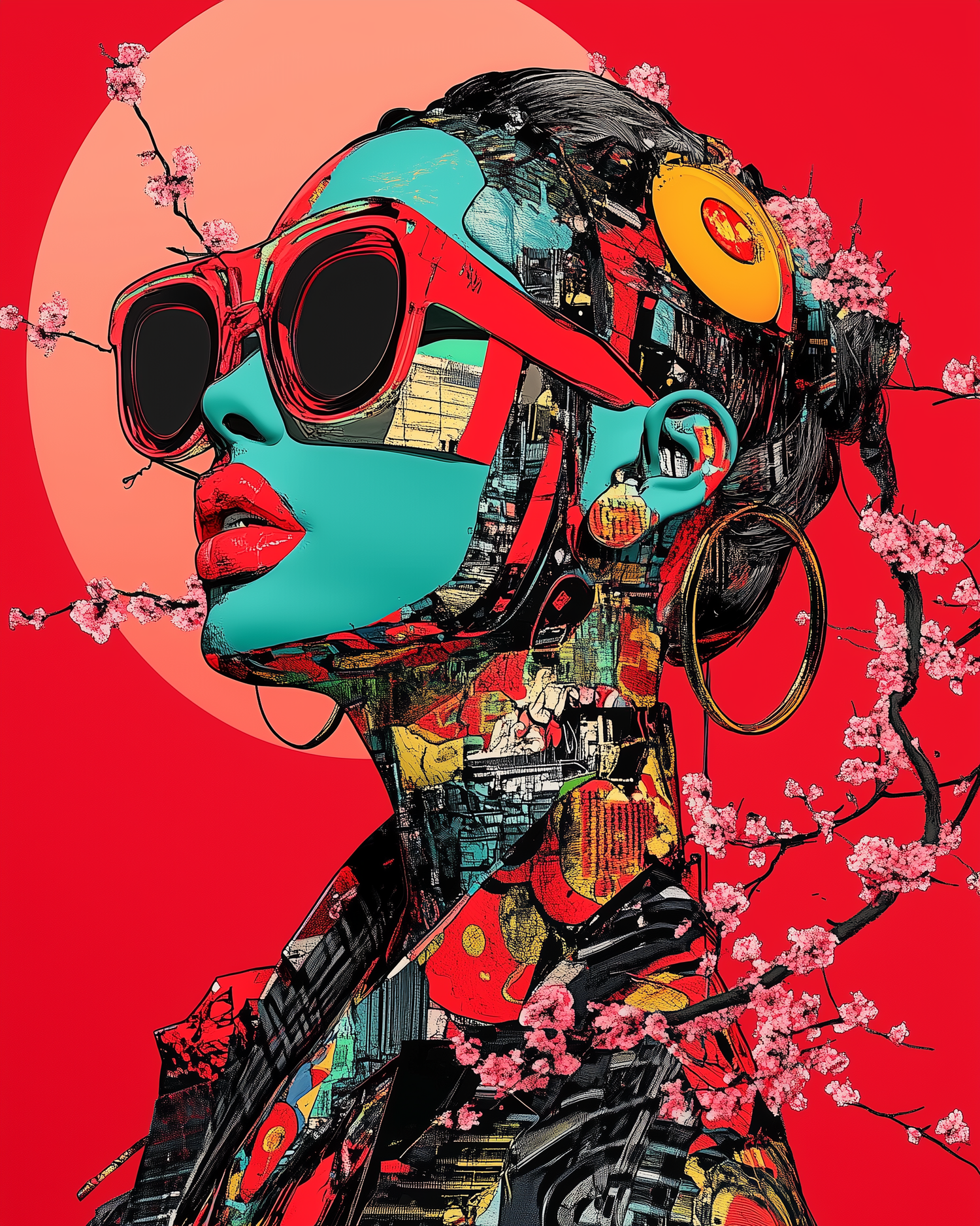 The face your algorithm shows you when you're about to confess something. Cherry blossoms pierce the code like guilt through a birthday text. She’s not listening. She already knows.